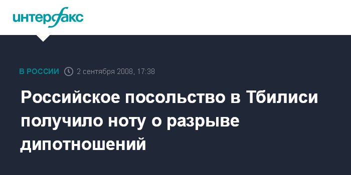 Тбилиси. 2 сентября. INTERFAX.RU - В МИД Грузии советнику-посланнику посольства РФ Александру Смаге была передана нота о разрыве дипломатических отношений между двумя странами.