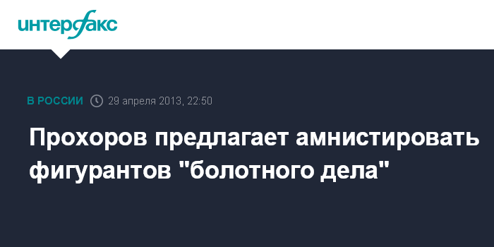 Москва. 29 апреля. INTERFAX.RU - Лидер "Гражданской платформы", бизнесмен Михаил Прохоров высказался за амнистию осужденных и обвиняемых по делу о беспорядках на Болотной площади в Москве в мае прошлого года. "Думаю, амнистировать их - самый разумный выход", - написал Прохоров в своем микроблоге в "твиттере".
