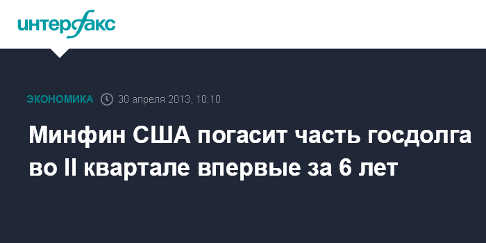 Вашингтон. 30 апреля. INTERFAX.RU - Министерство финансов США выплатит небольшую часть госдолга впервые за шесть лет, погашение будет произведено в течение второго квартала 2013 г., говорится в сообщении ведомства.