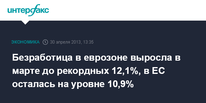 30 апреля. FINMARKET.RU - Безработица в 17 странах еврозоны в марте 2013 года поднялась до рекордных 12,1% с 12% месяцем ранее, свидетельствуют данные Статистического управления Европейского союза.