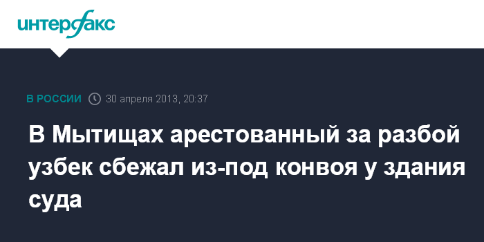 Москва. 30 апреля. INTERFAX.RU - Арестованный гражданин Узбекистана сбежал от конвоя у здания Мытищинского городского суда, сообщили "Интерфаксу" в пресс-службе ГУ МВД России по Московской области.