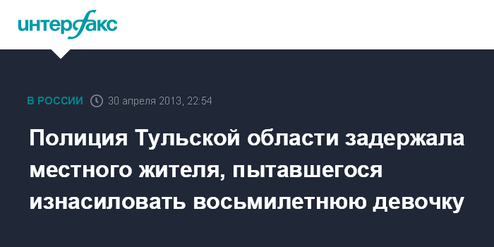 Тула. 30 апреля. INTERFAX.RU - Правоохранительные органы Тульской области задержали 60-летненго жителя Ленинского района, пытавшегося совершить изнасилование восьмилетней девочки, сообщил "Интерфаксу" руководитель пресс-службы областного УМВД Андрей Ярцев.