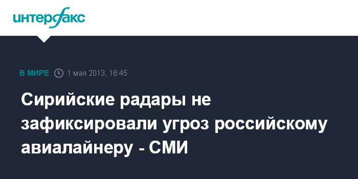 Бейрут. 1 мая. INTERFAX.RU - Сирийские радары не обнаружили никаких признаков того, что российский пассажирский самолет ранее на этой неделе попал под обстрел, сообщает в среду сирийское государственное агентство SANA.
