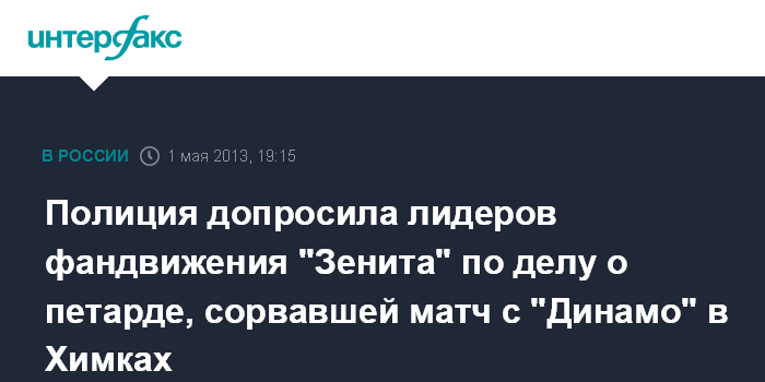 Санкт-Петербург.1 мая. ИНТЕРФАКС СЕВЕРО-ЗАПАД - Сотрудники полиции допросили в Петербурге нескольких человек в рамках расследования инцидента на стадионе в Химках осенью 2012 года, когда брошенная с трибуны фанатов "Зенита" петарда сорвала матч с московским "Динамо".