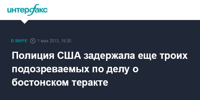 Вашингтон. 1 мая. ИНТЕРФАКС - Полиция Бостона объявила в среду о задержании еще троих подозреваемых в рамках расследования произошедшего недавно теракта на городском марафоне.