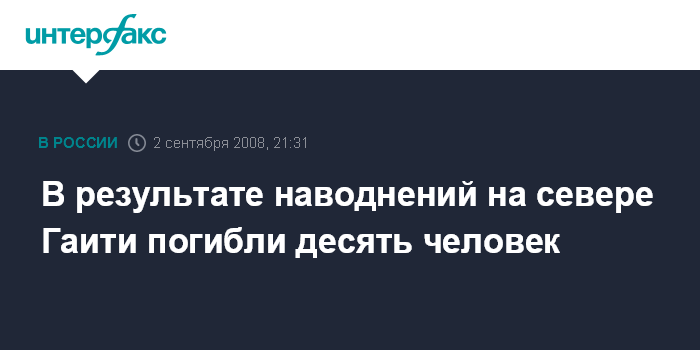 Гавана. 2 сентября. ИНТЕРФАКС - По меньшей мере десять человек погибли на севере Гаити, в результате наводнений, вызванных тропическим штормом "Ханна", сообщают местные власти. Не исключено, что эта буря может в будущем усилиться и превратиться в ураган.