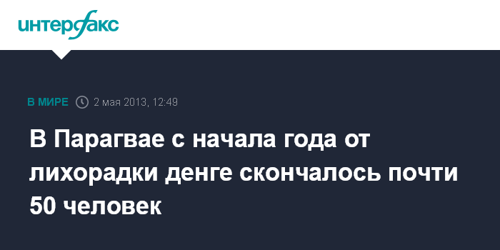 Москва. 2 мая. INTERFAX.RU - В Парагвае с января по апрель 2013 года от лихорадки денге скончалось 48 человек, сообщает латиноамериканское информационное агентство Prensa Latina.