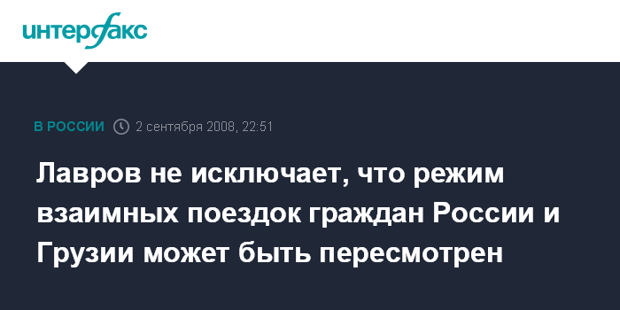 "Если, разрывая дипотношения, наши грузинские коллеги хотят в полной мере сохранить возможность визового обслуживания, то мы хотели бы повнимательнее посмотреть на эту ситуацию. Потому что разрывая дипотношения, оставлять режим взаимных поездок, как будто ничего не произошло – наверное, трудно рассчитывать, что это будет воспринято нормально", - сказал С.Лавров.