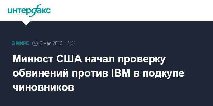 Нью-Йорк. 3 мая. INTERFAX.RU - Министерство юстиции США начало проверку деятельности International Business Machines Corp. (IBM), крупнейшего мирового поставщика компьютерных услуг, подозреваемого в подкупе иностранных должностных лиц с целью получения контрактов, сообщает агентство Bloomberg.
