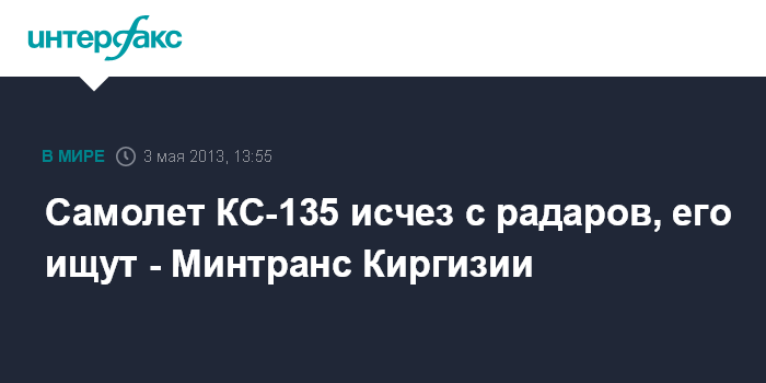 Бишкек. 3 мая. INTERFAX.RU - Самолет КС-135 потерял связь с Центром транзитных перевозок, расположенным в аэропорту Бишкека "Манас", откуда он вылетел в 14:30 местного времени, и сейчас предпринимаются меры по поиску самолета, сообщили "Интерфаксу" в пятницу в пресс-службе министерства транспорта и коммуникаций Киргизии. Самолет исчез с экранов радаров, сказали в ведомстве.