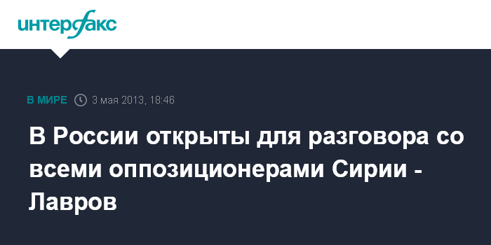 Любляна. 3 мая. INTERFAX.RU - Москва готова к переговорам со всеми представителями сирийской оппозиции, заявил глава МВД Сергей Лавров, комментируя заявления представителя оппозиционной Сирийской свободной армии Салима Идриса о готовности в любой момент начать переговоры с Москвой.