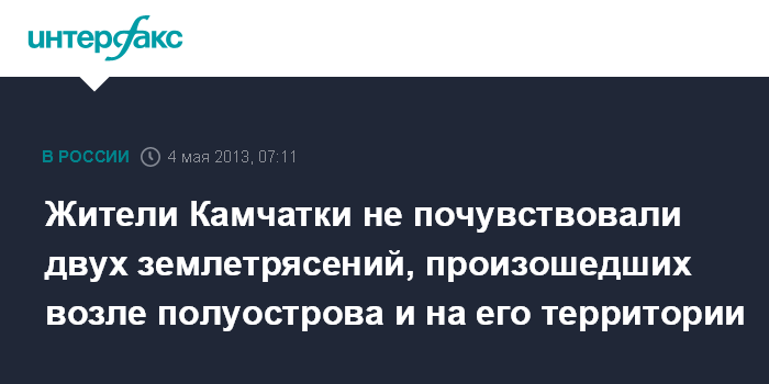 Петропавловск-Камчатский. 4 мая. ИНТЕРФАКС-ДАЛЬНИЙ ВОСТОК - Сейсмологи зарегистрировали два землетрясения, одно из которых произошло возле Камчатки, а другое - на ее территории, сообщил агентству "Интерфакс-Дальний Восток" в субботу представитель камчатского филиала Геофизической службы РАН.