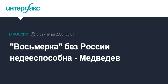 "Восьмерка" без России существовать не сможет, а если она и будет пытаться собираться, то это будет совсем не на пользу миропорядку", - сказал Д.Медведев, отвечая на вопрос телеканала "Евроньюс" по поводу звучащих на Западе предложений об исключении России из "восьмерки".