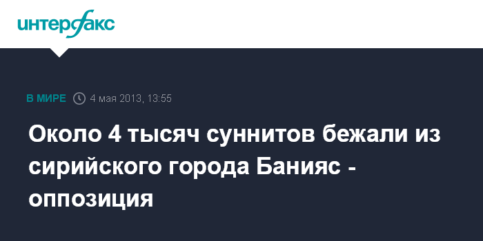 Лондон. 4 мая. INTERFAX.RU - Тысячи мусульман-суннитов уезжают из города Банияса на северо-западе Сирии из-за массовых убийств, предположительно совершенных правительственными военными, сообщили в субботу представители базирующегося в Лондоне оппозиционного Наблюдательного совета по правам человека в Сирии.