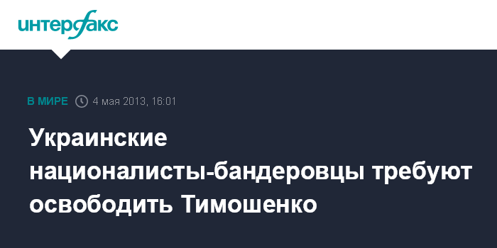 Киев. 4 мая. INTERFAX.RU - Организация украинских националистов (бандеровцев) настаивает на немедленном освобождении экс-премьера Украины Юлии Тимошенко на основании решения Европейского суда по правам человека.