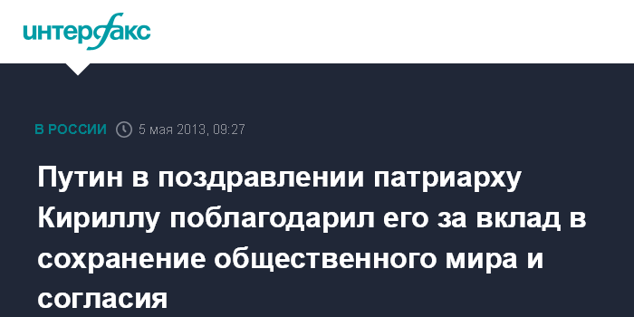 Путин в поздравлении патриарху Кириллу поблагодарил его за вклад в сохранение общественного мира и согласия