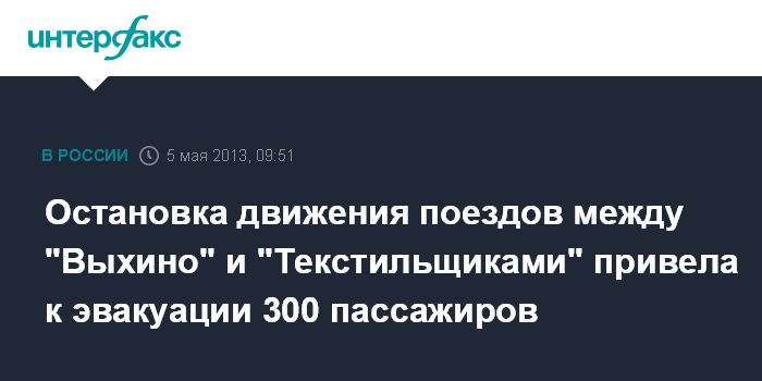 Москва. 5 мая. ИНТЕРФАКС - 300 человек эвакуированы в воскресенье утром со станции метро "Выхино" из-за остановки поездов.