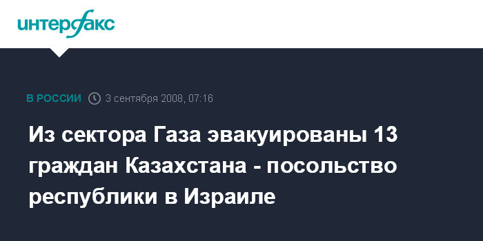 Астана. 3 сентября. ИНТЕРФАКС-КАЗАХСТАН - Тринадцать граждан Казахстана эвакуированы с территории сектора Газа в Палестине, сообщили агентству "Интерфакс-Казахстан" в посольстве республики в Израиле.