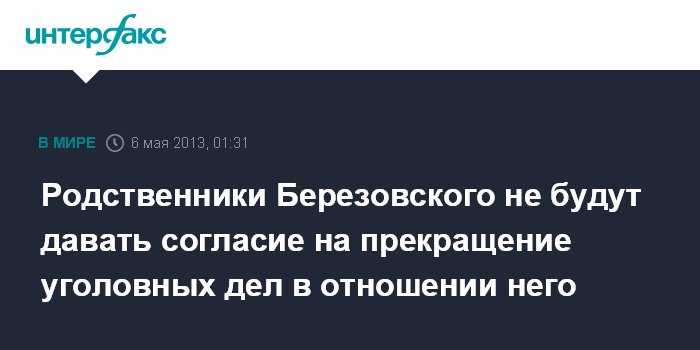Москва/Лондон. 6 мая. ИНТЕРФАКС - Родственники Бориса Березовского, который в марте скончался в Великобритании, не будут давать согласие на прекращение уголовных дел в России против него.