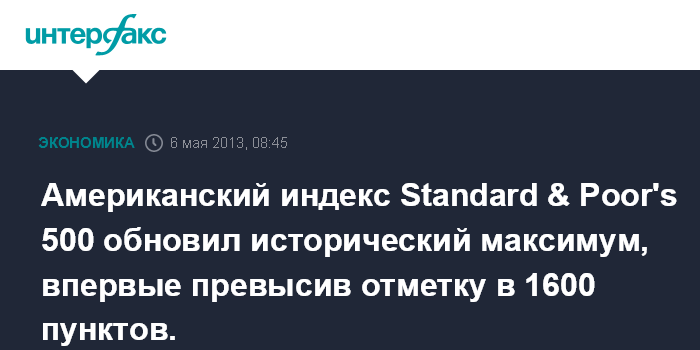 Standard & Poor's 500 обновил исторический максимум, впервые превысив отметку в 1600 пунктов. Как отмечает MarketWatch, прошло более 13 лет с того времени, когда индекс в первый раз пересек уровень в 1500 пунктов в марте 2000 года, до того момента, когда он превзошел рубеж в 1600 пунктов.