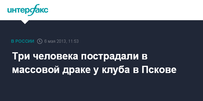 Псков. 6 мая. INTERFAX.RU - Три человека получили ножевые и огнестрельные ранения в массовой драке у ночного клуба в Пскове, сообщает пресс-служба областного УМВД. "5 мая в 05:59 мск в дежурную часть поступило сообщение о том, что возле дома 16 по Рижскому проспекту происходит драка. Выяснилось, что между посетителями клуба произошел конфликт, переросший в драку на улице", - отмечается в сообщении ведомства.