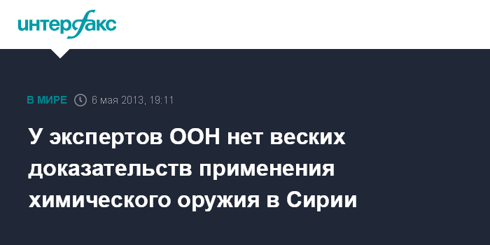 Женева. 6 мая. INTERFAX.RU - Эксперты из комиссии ООН по расследованию нарушений прав человека в Сирии пока не собрали убедительных доказательств применения одной из конфликтующих сторон химического оружия в Сирии, говорится в заявлении комиссии, опубликованном в понедельник.