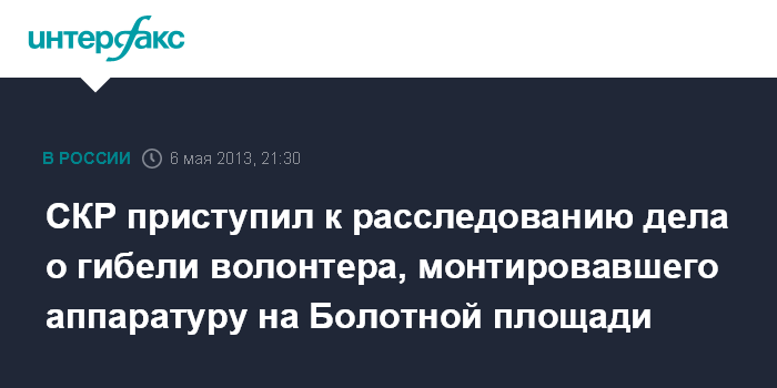 Москва. 6 мая. INTERFAX.RU - По факту гибели волонтера, который монтировал звуковое оборудование перед митингом на Болотной площади в Москве, возбуждено уголовное дело - организация, отвечавшая за подготовку сцены, допустила грубые нарушения, сообщили "Интерфаксу" в СКР.