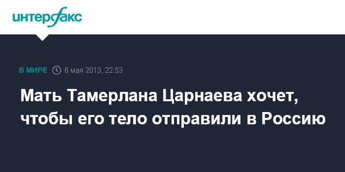 Вашингтон. 6 мая. INTERFAX.RU - Мать Тамерлана Царнаева Зубейдат попросила владельца похоронного бюро города Уорчестера Питера Стефана организовать доставку тела ее покойного сына из США в Россию, сообщает в понедельник веб-сайт местного издания Boston Herald.