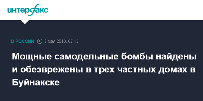Ростов-на-Дону. 7 мая. ИНТЕРФАКС-ЮГ - Три самодельных взрывных устройства (СВУ) большой мощности были обнаружены и обезврежены в трех частных домах города Буйнакска (Дагестан), сообщили агентству "Интерфакс-Юг" в городском управлении полиции.