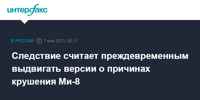 Чита. 7 мая. INTERFAX.RU - Следствие считает преждевременным делать выводы и выдвигать версии причин крушения вертолета Ми-8 в Иркутской области, сообщили агентству "Интерфакс-Сибирь" в Восточно-Сибирском следственном управлении на транспорте.