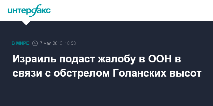 Иерусалим. 7 мая. INTERFAX.RU - Армия обороны Израиля направит жалобу в штаб-квартиру Сил ООН по наблюдению за разъединением (СООННР) на Голанских высотах после того, как на этой территории взорвались два выпущенных с территории Сирии снаряда, передали в понедельник местные СМИ.