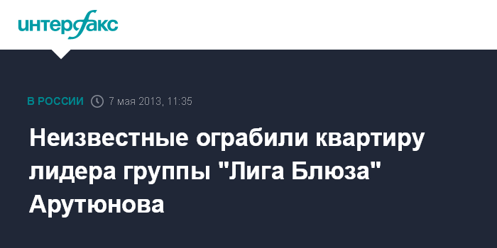 Москва. 7 мая. INTERFAX.RU - Квартира известного певца Николая Арутюнова, лидера группы "Лига Блюза", ограблена на севере столицы, сообщил "Интерфаксу" во вторник источник в правоохранительных органах.