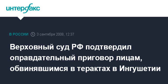 Москва. 3 сентября. INTERFAX.RU - Верховный суд РФ признал законным оправдательный приговор в отношении двух лиц, обвинявшихся ранее в совершении терактов на территории Ингушетии.