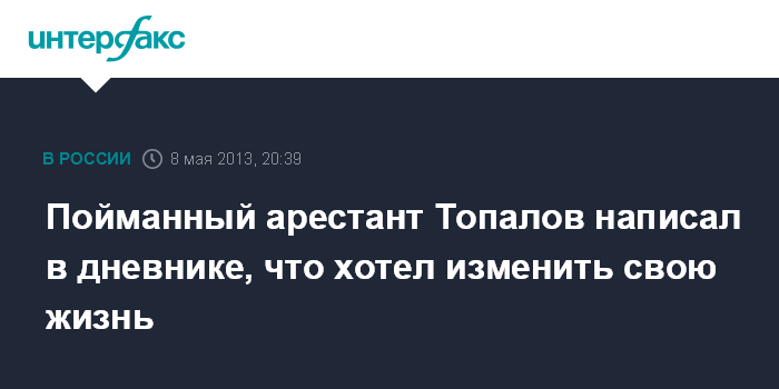 Москва. 8 мая. INTERFAX.RU - Полиция обнаружила у пойманного арестанта Олега Топалова дневник; согласно записям в нем он хотел "изменить свою жизнь", сообщили "Интерфаксу" в пресс-службе ГУ МВД России по Москве.