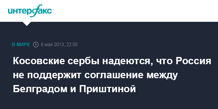 Белград. 8 мая. INTERFAX.RU - Проживающие на севере Косово сербы обратились с призывом к властям России выступить против соглашения о нормализации отношений между Белградом и Приштиной, сообщает в среду телеграфное агентство Новая Югославия TANJUG.