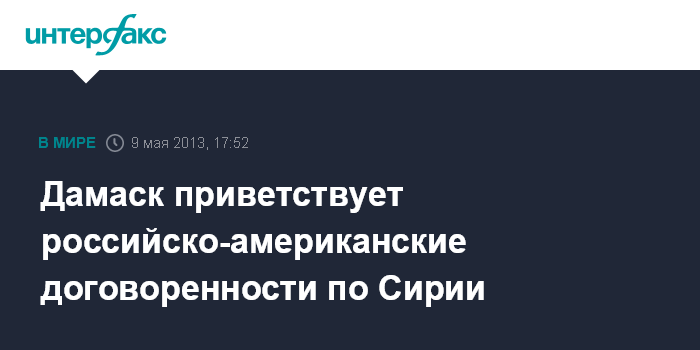 Бейрут. 9 мая. INTERFAX.RU - В Дамаске приветствуют сближение позиций России и США по Сирии, сообщает сирийское телевидение.