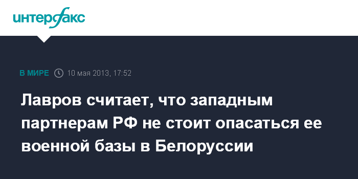 Варшава. 10 мая. INTERFAX.RU - Глава МИД РФ Сергей Лавров считает, что западным партнерам РФ не стоит опасаться ее военной базы в Белоруссии. "Не вижу причин волноваться на эту тему", - сказал он российским журналистам в субботу.