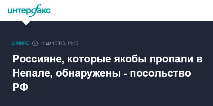 Катманду/Москва. 11 мая. INTERFAX.RU - Российские туристы, которых на этой неделе искали в Непале, найдены, они находятся в гостинице в Катманду, их здоровью ничего не угрожает, сообщил по телефону "Интерфаксу" в субботу пресс-атташе российского диппредставительства в Катманду Азрет Боташев.