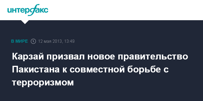 Кабул. 12 мая. INTERFAX.RU - Президент Афганистана Хамид Карзай в воскресенье призвал новое пакистанское правительство к совместной борьбе с экстремистами. "Мы надеемся, что новое правительство проложит путь к миру и братству с Афганистаном и будет сотрудничать в борьбе с терроризмом и искоренении убежищ террористов", - говорится в заявлении Х.Карзая.