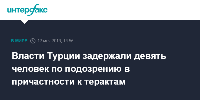 Стамбул. 12 мая. INTERFAX.RU - По подозрению в причастности к взрывам в городе Рейханлы на турецко-сирийской границе в воскресенье задержаны девять человек, заявил заместитель премьер-министра Турции Бешир Аталай. Он также добавил, что количество жертв терактов возросло до 46. Как сообщалось, в результате взрывов в Рейханлы в субботу ранения получили около 100 человек.