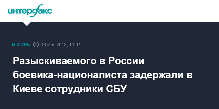 Киев. 13 мая. INTERFAX.RU - Сотрудники Службы безопасности Украины в Киеве 10 мая задержали человека, который находился в международном розыске за совершение тяжких преступлений на территории Российской Федерации.