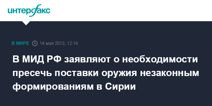 Москва. 14 мая. INTERFAX.RU - В Москве считают необходимым принять меры для пресечения поставок оружия вооруженной сирийской оппозиции.