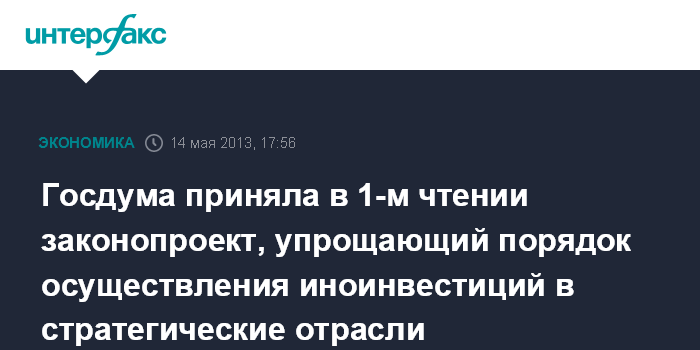14 мая. FINMARKET.RU - Госдума приняла в первом чтении законопроект, направленный на либерализацию процедур контроля за осуществлением иностранных инвестиций в хозяйственные общества, имеющие стратегическое значение, а также на устранение излишних административных барьеров для иностранных инвесторов при совершении ими сделок.
