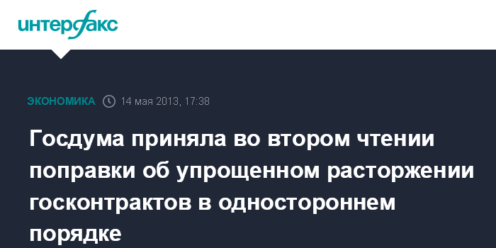 14 мая. FINMARKET.RU - Сегодня на пленарном заседании Госдума РФ приняла во втором чтении поправки в закон о госзакупках, предусматривающие возможность одностороннего расторжения контрактов по инициативе заказчиков и поставщиков.