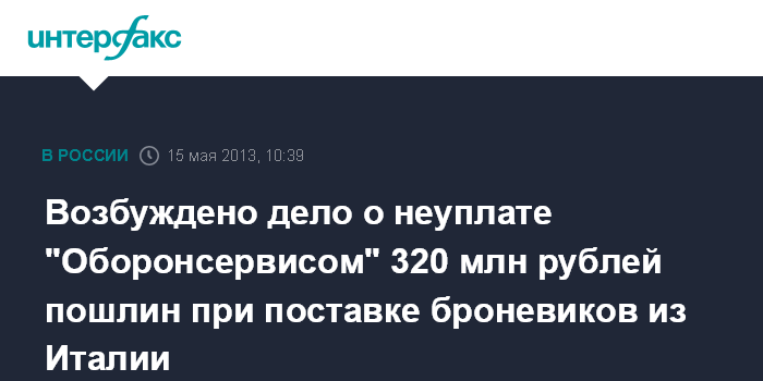 Москва. 15 мая. INTERFAX.RU - Руководство ОАО "Оборонсервис" подозревается в уклонении от уплаты таможенных платежей на сумму 320 млн рублей при реализации двух госконтрактов на поставку Минобороны более 250 итальянских бронеавтомобилей, сообщили в СКР.