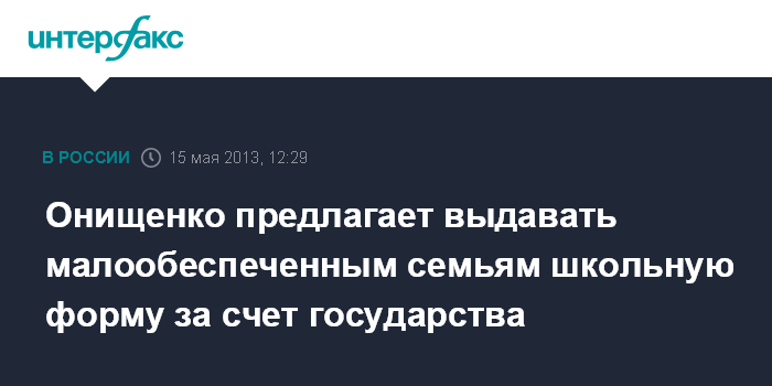 Москва. 15 мая. INTERFAX.RU - Руководитель Роспотребнадзора, главный государственный санитарный врач РФ Геннадий Онищенко выступает за введение в стране обязательной школьной формы, но предлагает выдавать ее малообеспеченным семьям бесплатно.