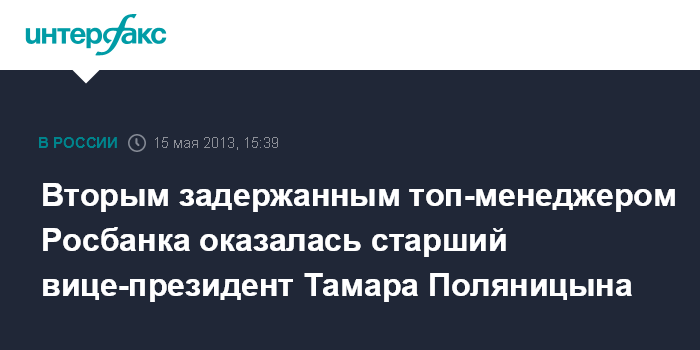 Москва. 15 мая. INTERFAX.RU - МВД РФ назвало имя старшего вице-президента Росбанка, которая была задержана по подозрению в получении незаконного денежного вознаграждения в 5 млн рублей - это Тамара Поляницына.