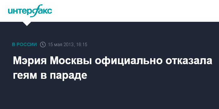 Москва. 15 мая. INTERFAX.RU - Власти Москвы официально отказали представителям сексуальных меньшинств в проведении 25 мая гей-парада, а также пикета 26 мая.