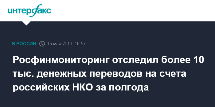 Москва. 15 мая. INTERFAX.RU - По данным Росфинмониторинга, с начала действия закона "Об НКО иностранных агентах" (с ноября 2012 года) на счета российских НКО было сделано более 10 тыс. переводов средств из-за рубежа, сообщили в Минюсте РФ.