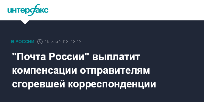 Москва. 15 мая. INTERFAX.RU - ФГУП "Почта России" разъяснила порядок компенсации ущерба, понесенного его клиентами в результате пожара в ММПО "Москва". В соответствии с конвенцией Всемирного почтового союза, компенсация за почтовое отправление должна выплачиваться отправителю, говорится в сообщении "Почты".